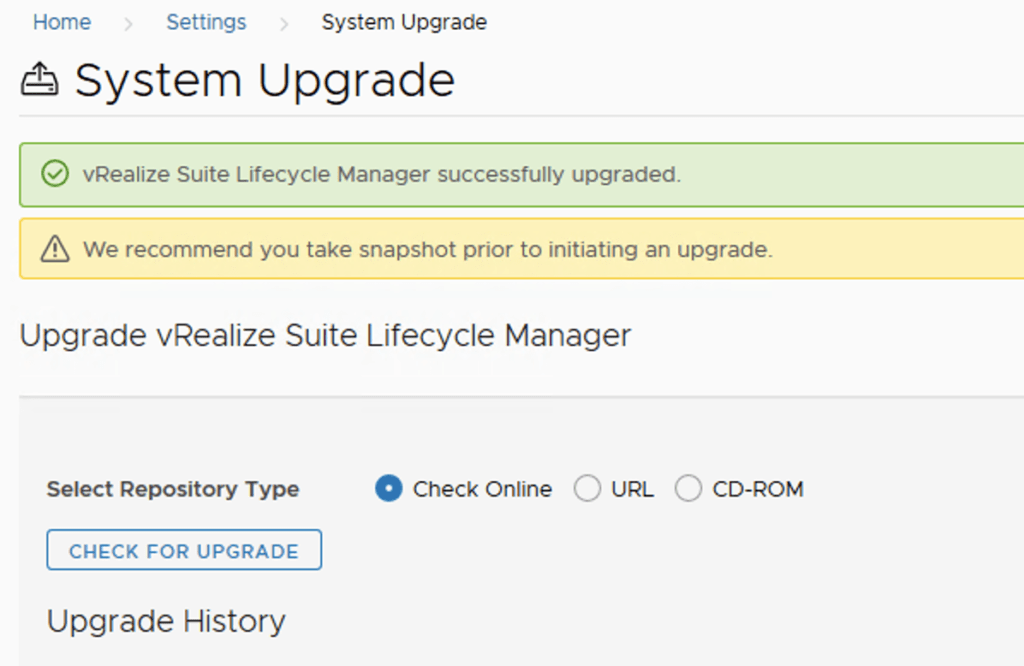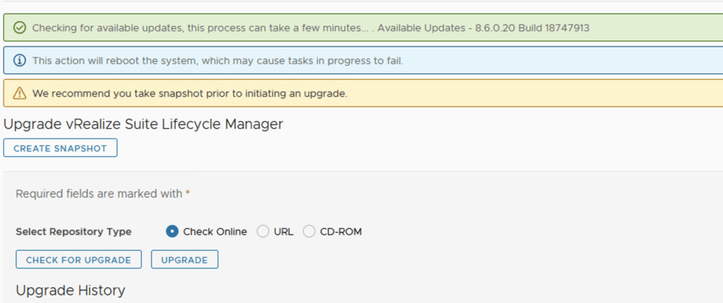 In this guide i will go over the steps of getting an existing 8.x vRSLCM appliance upgraded to the latest 8.6 release. The release notes can be found here