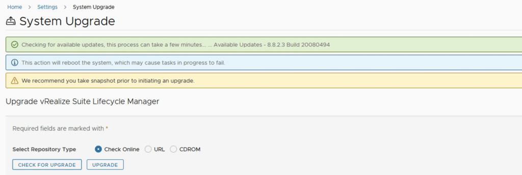 In this guide i will go over the steps of getting an existing 8.x vRSLCM appliance upgraded to the latest 8.8.2 release. The release notes can be found here