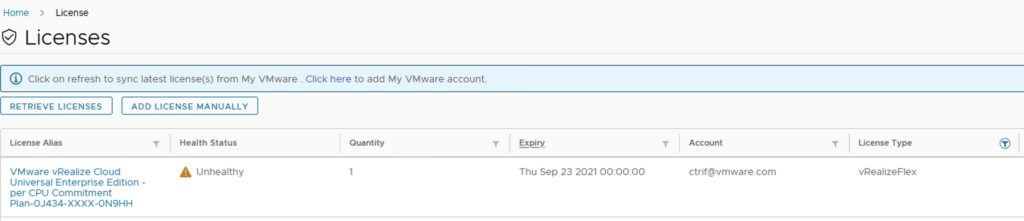 Once in locker we can go to Licenses and search for our subscription license. The license will show up as vRealizeFlex under the license type