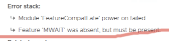 Looking at the error details it looks like it is looking for a feature called cpuid.mwait