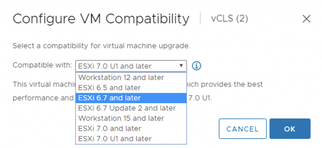 We can disable EVC on per VM level on version 14 and above, so in my case i chose ESXi 6.7U2 and later