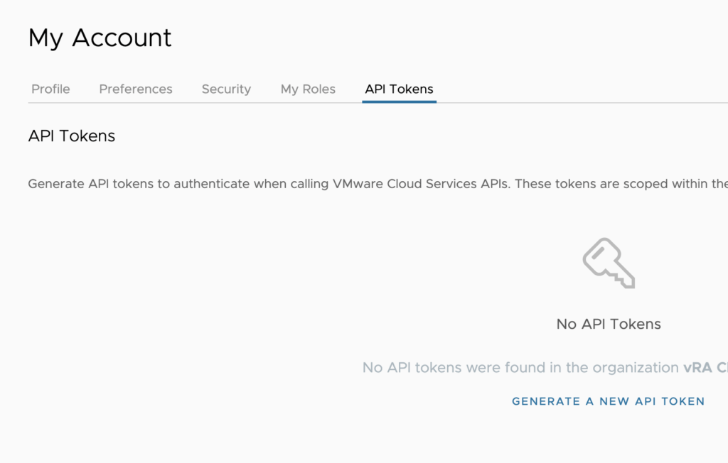 First step is to get an API token for the specific username. We can do this by going to My account under User Settings in vRA Cloud