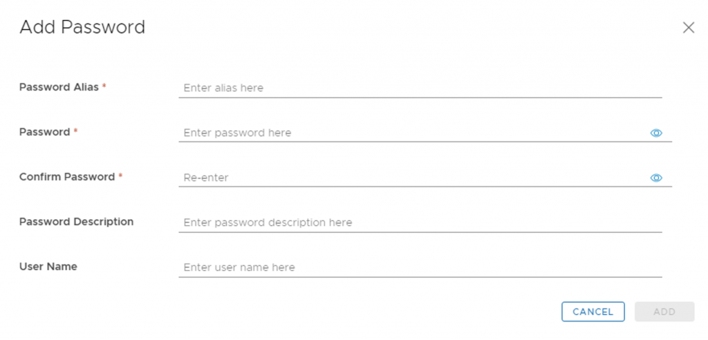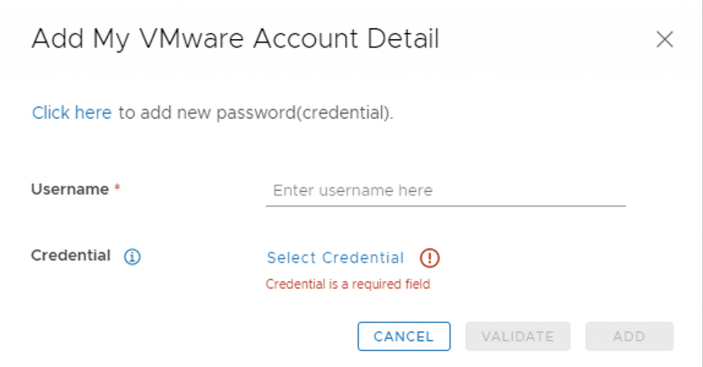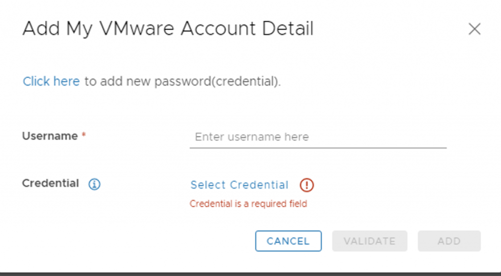 With the releases of 8.x and above we now have a password vault that we need to add the passwords to. When presented with the add my VMware Account Detail screen press on Click here to add a new password