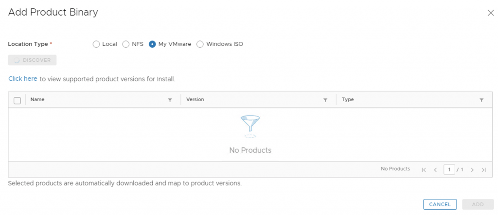 We can add binaries from a local source, NFS, My VMware or Windows ISO. In this scenario we can download the binaries directly from My VMware. Click on my VMware and click discover