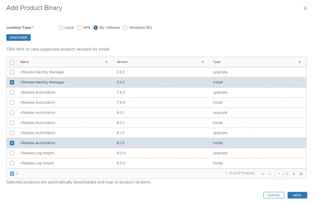 In my case i want to download vRealize Automation and VMware Identity Manager. So i selected th downloads as install type and clicked on add
