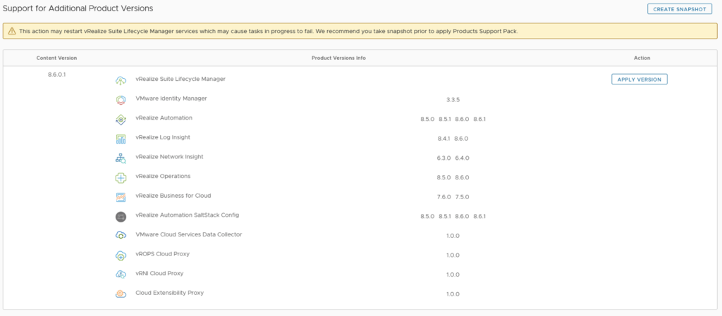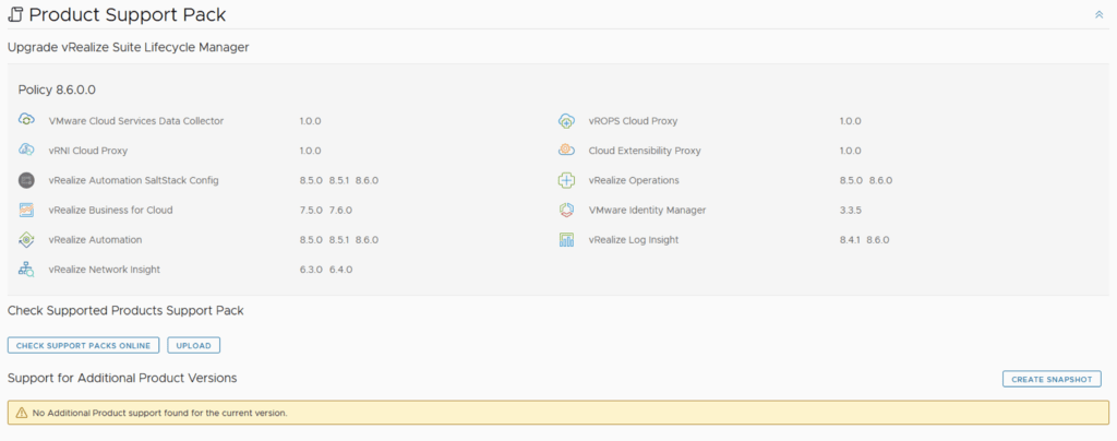 We can see that i recently upgraded to 8.6 however a new update is available 8.6.0.1. Based on what we can see in the details the new support pack adds support for vRA 8.6.1. If an update is not available click on the Check Support Packs Online button and refresh the screen within a few minutes