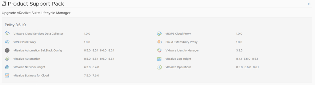 We can see that i recently upgraded to 8.6 however a new update is available 8.6.0.1. Based on what we can see in the details the new support pack adds support for vRA 8.6.1. If an update is not available click on the Check Support Packs Online button and refresh the screen within a few minutes